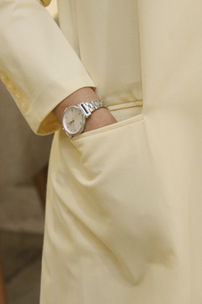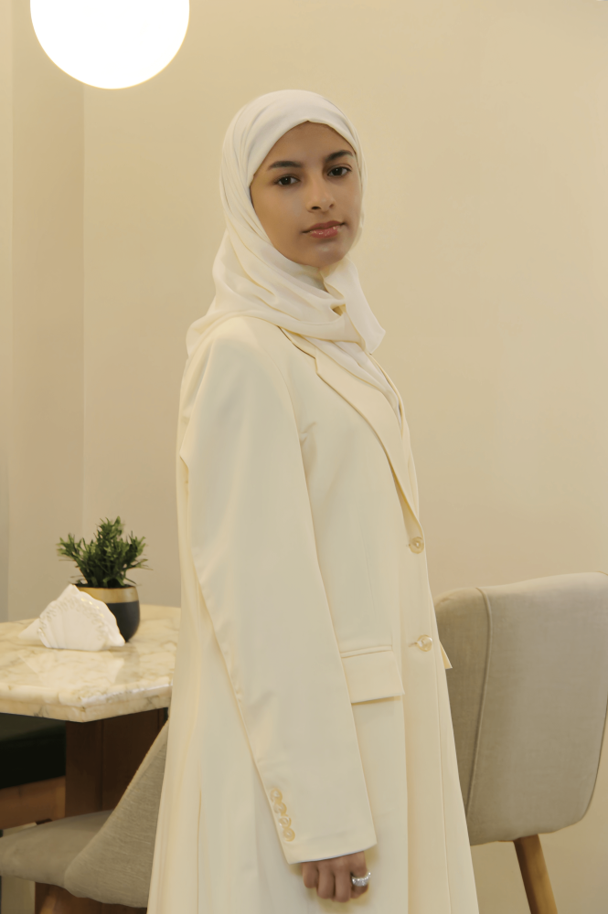 اكتشفي أناقة لا تضاهى مع هذا البليزر الكريمي الفاتح الذي يجمع بين البساطة والفخامة. تصميمه الانسيابي وخياطته الدقيقة تمنحك حضورًا واثقًا، بينما تضيف الأزرار اللامعة ولمسة القَصّة الرسمية طابعًا عصريًا يناسب إطلالات العمل أو المناسبات الراقية.